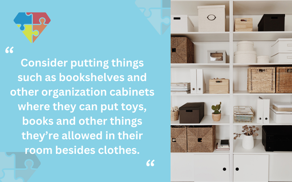 This may take a little legwork on the part of parents and caregivers. Consider putting things such as bookshelves and other organization cabinets where they can put toys, books and other things they’re allowed in their room besides clothes.