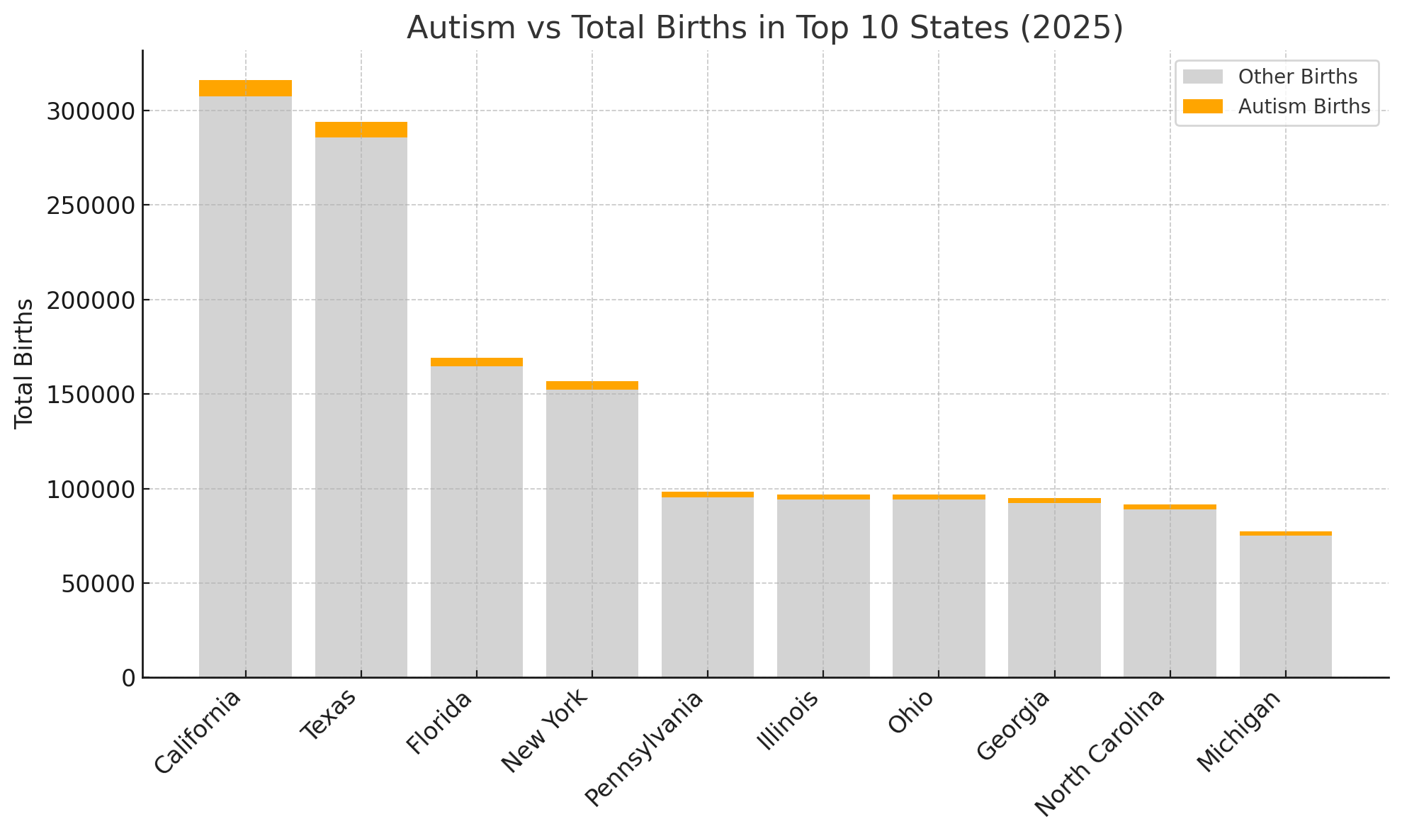 If we use the nationwide autism prevalence rate of 1 in 36 children, we can estimate how many babies have been born with autism in each state this year.