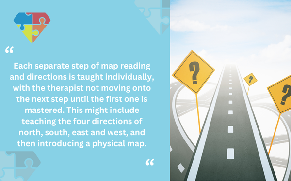 Cada paso de la lectura de mapas e indicaciones se enseña por separado, y el terapeuta no pasa al siguiente paso hasta que no se domina el primero. Por ejemplo, se enseñan las cuatro direcciones (norte, sur, este y oeste) y luego se introduce un mapa físico.