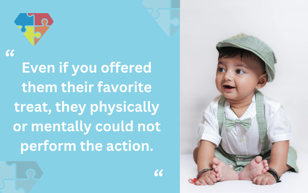 El "no poder", o la incapacidad de hacer algo, ocurre cuando un niño carece de las habilidades necesarias, la planificación motora o el procesamiento cognitivo para completar una tarea. Incluso si les ofrecieras su golosina favorita, física o mentalmente no podrían realizar la acción.