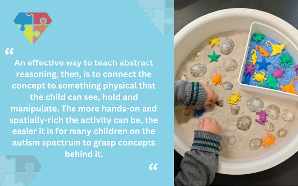 Una forma eficaz de enseñar el razonamiento abstracto es relacionar el concepto con algo físico que el niño pueda ver, sostener y manipular. Cuanto más práctica y espacial sea la actividad, más fácil les resultará a muchos niños autistas comprender los conceptos que hay detrás.