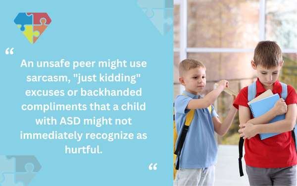 An unsafe peer might use sarcasm, “just kidding” excuses or backhanded compliments that a child with ASD might not immediately recognize as hurtful.