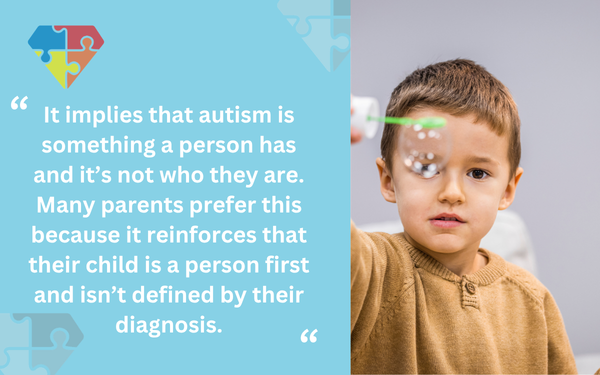 It implies that autism is something a person has and it’s not who they are. Many parents prefer this because it reinforces that their child is a person first and isn’t defined by their diagnosis.