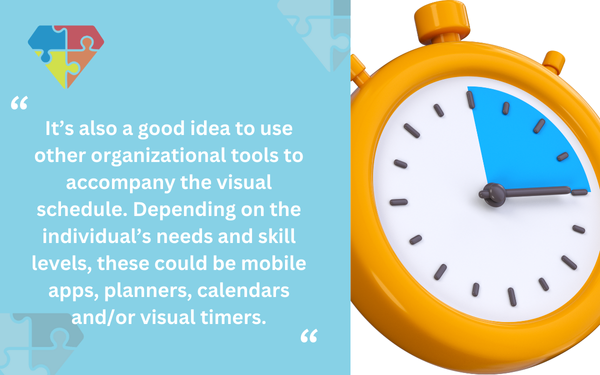 It’s also a good idea to use other organizational tools to accompany the visual schedule. Depending on the individual’s needs and skill levels, these could be mobile apps, planners, calendars and/or visual timers.