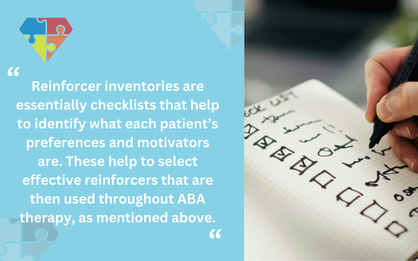 Reinforcer inventories are essentially checklists that help to identify what each patient’s preferences and motivators are. These help to select effective reinforcers that are then used throughout ABA therapy, as mentioned above.