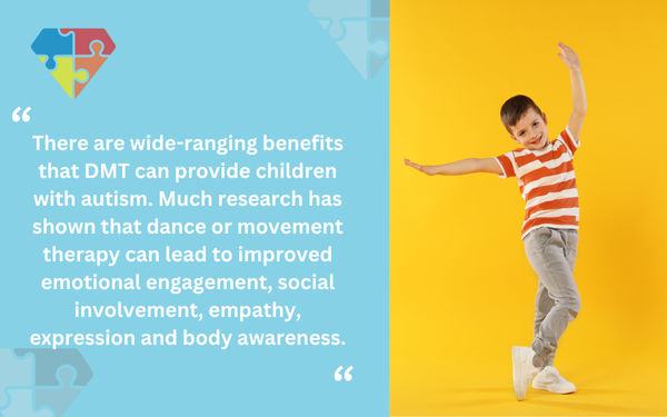 There are wide-ranging benefits that DMT can provide children with autism. Much research has shown that dance or movement therapy can lead to improved emotional engagement, social involvement, empathy, expression and body awareness.