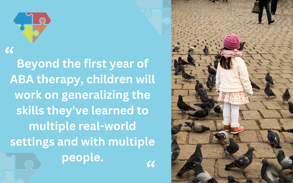 Beyond the first year of ABA therapy, children will work on generalizing the skills they’ve learned to multiple real-world settings and with multiple people. Depending on their needs, therapy could also include community integration, academic skills and more.